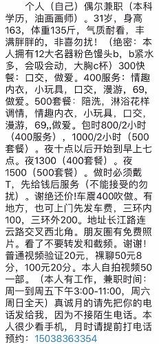 [xinxitop]提示信息[/xinxitop] 【寻欢时间】:2019年11月 【寻欢地点】:南三环长江路 【信息来源】:狼友推荐、论坛、亲身体验 【服务项目】:69式,口活,爱爱 【妹妹数量】:1 【环境设备】:公寓 【营业时间】:自己问 【价格一览】:400/次 【安全评估】:下来接的,上电梯得刷卡 【服务星级】:★★★一般 【重点推荐】:会出水,粉嫩 【联系方式】:[unfree]VX Yd20110309[/unfree] 【寻欢细节】:因为是验证贴,就不详细写了,这个人优雅,有的也不买了。只说优缺点。优点:口活很厉害,下面会动,做的时候出水,床单都湿了一点,第一次见这么粉嫩的。缺点:在乎外貌的就不用去了,身材也不是好,也不像上个帖子有狼友说的有200斤,目测130斤左右。 【附带照片】: 【验证截图】: