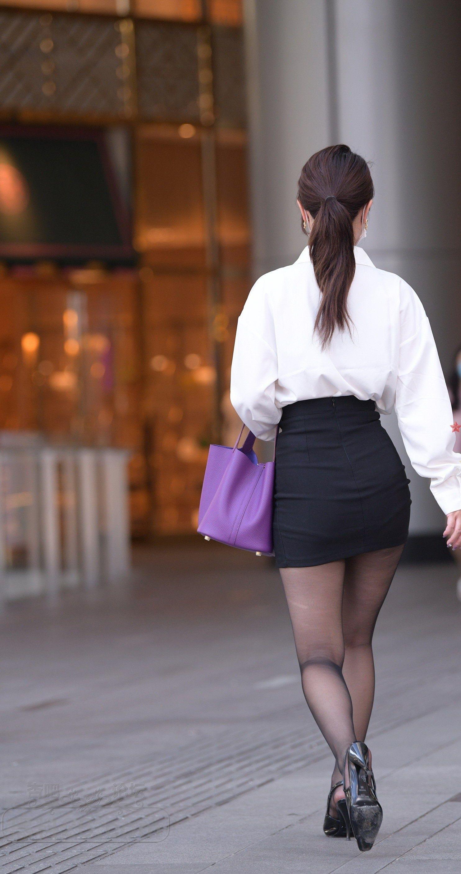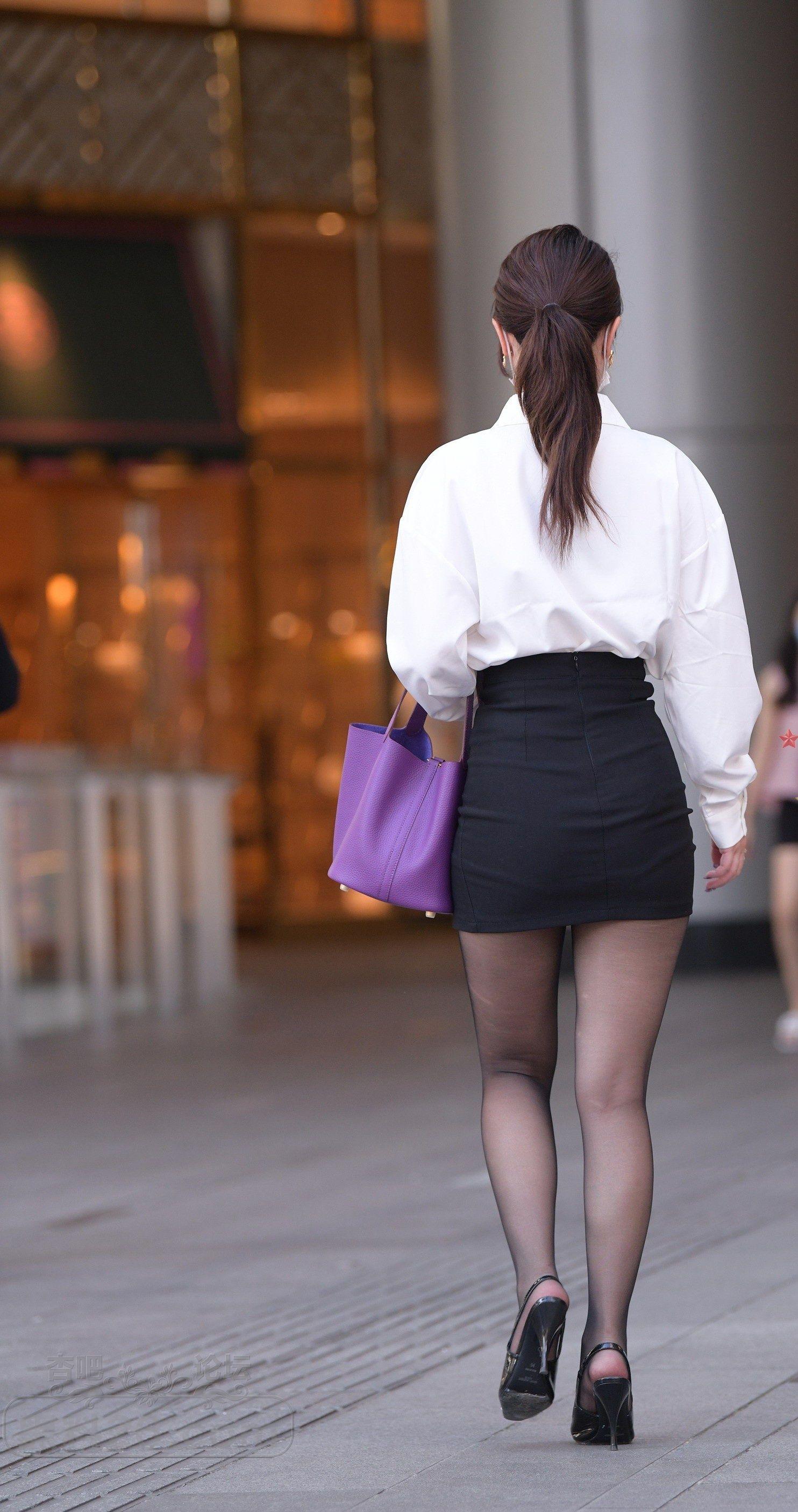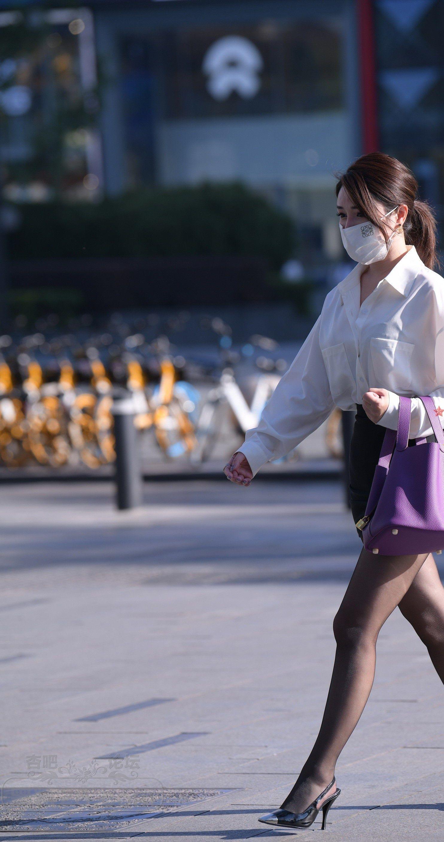[街拍] 白色长袖黑色短裙丝袜职业装口罩女步行去上班【10P】 |