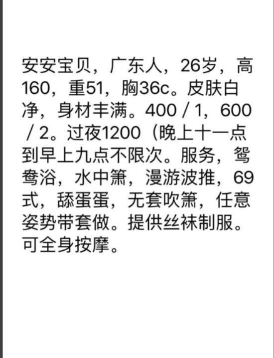 标题没有写联系成功的帖子请谨慎购买,不一定能联系成功的,先钱不可信 【寻欢时间】:2016年11月 【寻欢地点】:天河 【信息来源】:网络 【服务项目】:很多 【妹妹数量】:没问 【环境设备】:该有都有 【营业时间】:这个需要自己问 【价格一览】:600/2H 【安全评估】:不去最安全 【服务星级】:70 【重点推荐】:无 【寻欢细节】:10月18日下午,天气阴,时不时下起小雨或暴雨,好久没出来活动,就快发霉,前段时间,知道天朗来了个妹子叫安安宝贝,听说很骚,由于工作的关系一直没时间。有一天突然间精虫上脑,心痒痒的,决定出去找个妹子交流交流下人生,上Q,看有没有附近的MM,哟呵,安安宝贝在线,上空间看照片,哟西,是我喜欢的类型,主要是够近,够方便,于是跟MM联系,问价格,600/2H,但是由于上脑了,管不了那么多,于是找了个借口从公司溜了出去,很快就到,又过了15分钟左右,终于把安安宝贝盼来了,进门一看,化了妆跟照片没什么出入,穿着丝袜短裙,上身是件衬衫毛衣,来了个熊抱,MM还是瞒有肉感的,MM上来就说了句不好意思久等 了,抱着MM在床上躺了会(本狼喜欢要有前戏的),当然手是没有停的,摸摸这摸摸那,MM可能是被摸的动情了,就主动把我的裤子脱了,坐在我腿上发骚,挑逗,说 要先干一炮,妹子在床上还 是比较风骚主动的坐在上面摇,摇得好爽!不一会安安拉着我坐起来,哇塞!一对巨乳在我脸上,二话没多说一手抓着奶一口吸另外一个奶。爽!最后还是传教士姿势冲刺,值得赞扬的一点,射了妹子还会紧紧抱着我停留在里面一会才出来。这点我个人感觉很好 。插着插着感觉MM越来越湿了,呻吟声也越叫越大声,我用手一摸,MM下面 全是淫水,我小弟都被她搞湿了。我加快的速度,继续做我的活塞运动。MM也开始用 双手抓住我的屁股用力往自己身上拉,没有多久,我感觉真的来了,再也忍不住了, 用力向MM最深处顶去,直到把这两个星期的积蓄全都给了MM为止,这时我感觉到MM阴 道里也有明显的收缩现象,我想MM也应该高潮了。我们抱着休息了一会,然后再次洗 澡离开。 【总体评价】:略 【联系方式】: