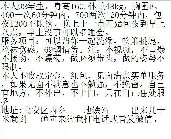 以上信息为网友分享,请在消费时自行判断谨慎消费。出现虚假信息和诈骗信息请站内短信给艾欧利雅:方法一:点击给艾欧利雅发短信——方法二:点击给艾欧利雅发短信 【寻欢日期】:2017年6月9号 【寻欢地址】:深圳西乡地铁站附近 【服务项目】:抱抱、KB、ML、洗澡、丝袜、调情 【小姐数量】:1 【小姐年龄】:24 【小姐外形】:90 【价格一览】:400P 700PP 包夜1200 【环境设备】:妹妹自带公寓还不错 【安全评估】:90 【营业时间】:能联系上就可以 【重点推荐】:身材好,长相好,皮肤好,服务好。 【联系方式】: 【寻欢细节】:在她朋友的微信看到的,一看,根本不比那些喊1500的差啊,过段加了约起。妹妹是92年的,长的自己看图,什么性价比自己对比。这个价格不能不说超值。 美女提出来她服务超级好,主动帮我洗澡,接下来按摩了下,用胸按摩全身,然后进行口交,舌头十分灵活丝滑,差点射了,不像其他女人一样机车敷衍.搞得我实在欲火难耐了,让她停了下来,自己坐上去,美女下面很紧,胸部就如少女般丝滑柔软又富有弹性,中间感觉快射了,美女水很多,实在舒服,最后小弟没坚持多久就射了,我休息差不多了就去浴室,妹妹还帮忙清洗身体. 以后会常去光顾妹妹。本不想这么快放出来,来赚点小金币。 【附带图片】: